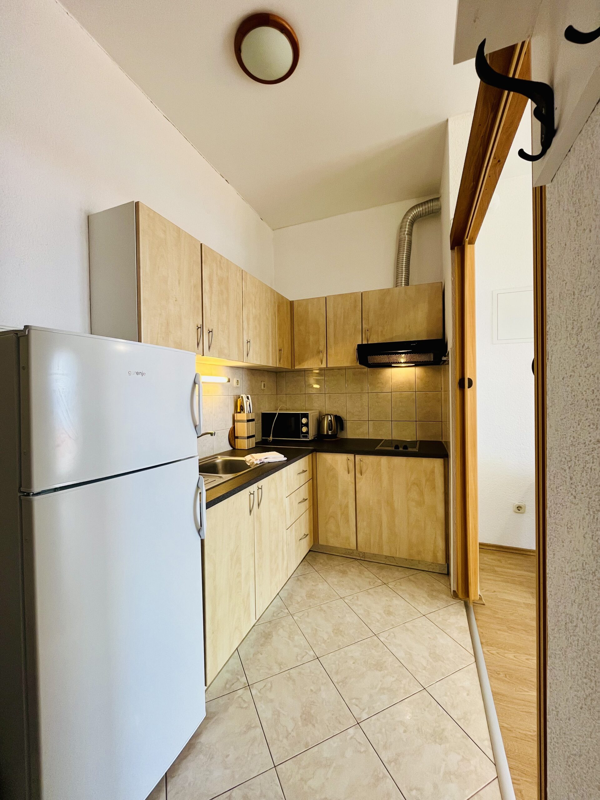 → Fully equipped kitchen with fridge, microwave, and electric kettle